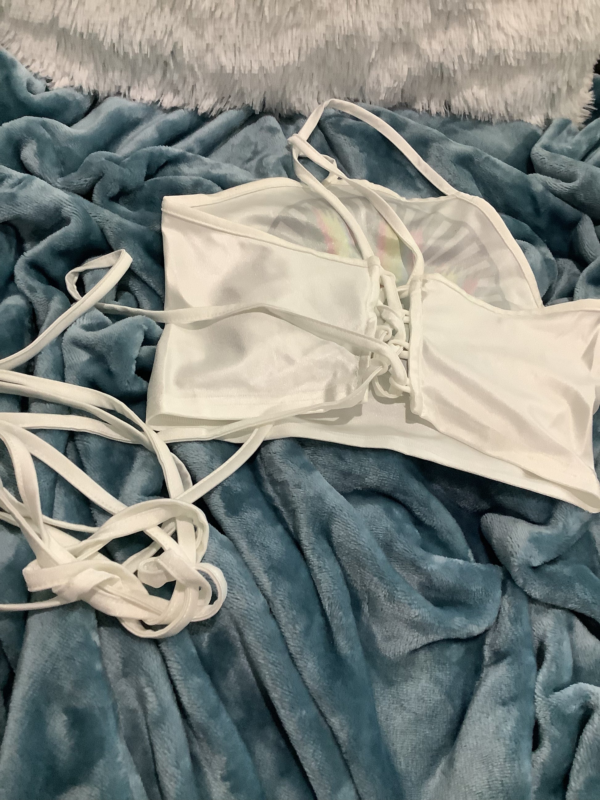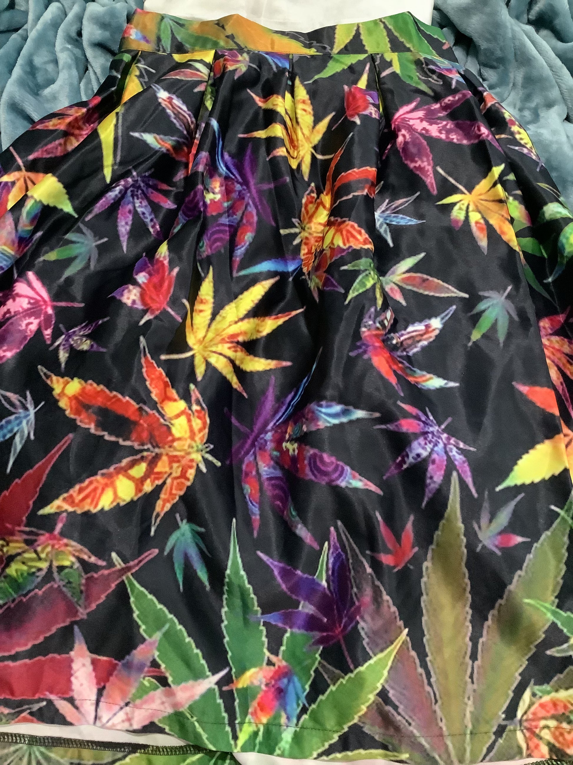 *420 Leaf Print Crop Top Laces Up In the Back SIZE SMALL *420 Leaf Print Pleated Skirt waist 24 inches stretches to 26 inches 24 inches in L. Side Zipper